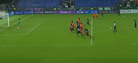 补时第3分钟,韩国禁区头球接力,皮球击中立柱弹出。