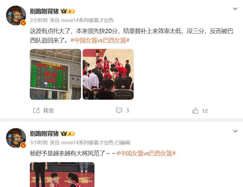 作者认为,本来中国女篮已经领先了快20分,结果替补上来由于得分效率太低没有三分,反而被巴西女篮追了回来。这是末节场上局势的转折点,宫鲁鸣作为主教练有两大失误。