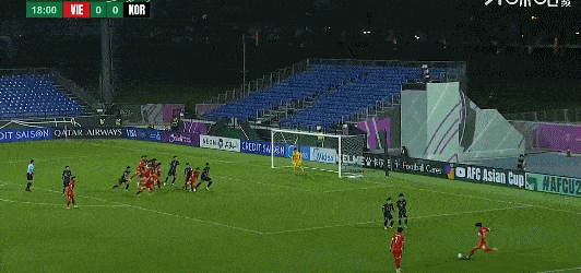 第71分钟,阮庭北任意球攻门,皮球钻过人墙入网,越南2-1韩国。